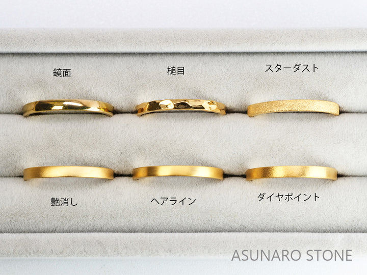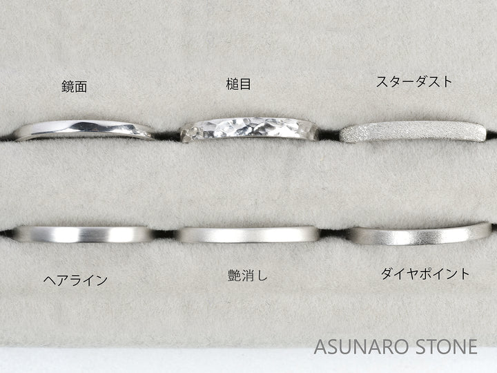 オプション加工には、ルース向き、ミル入れ(覆輪)、台座変更(1段・2段など)、爪変更、脇石変更、地金コンビ、テクスチャ加工(艶消し、スターダスト、槌目、ダイヤモンドポイント、ヘアライン)、文字入れ、額縁加工(ピアス・ペンダント)などがございます。オプションによっては、追加料金がかかるものもございますので、ご希望の場合はお気軽にご相談ください。