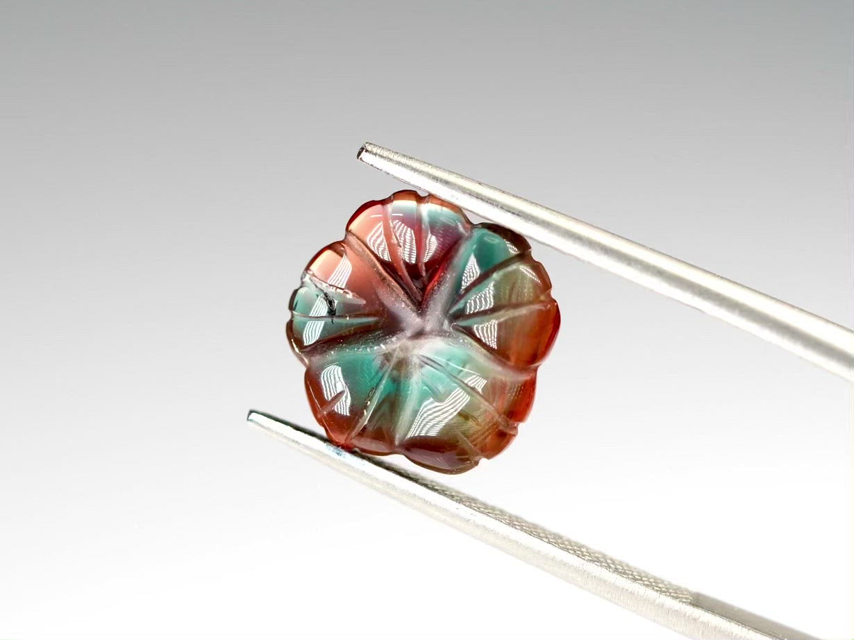 オレンジレッドカラーと、ピーコックグリーンカラーがグラデーションのように混ざり合う、大変珍しいバイカラーオレゴンサンストーンのフラワーカットのルースです。