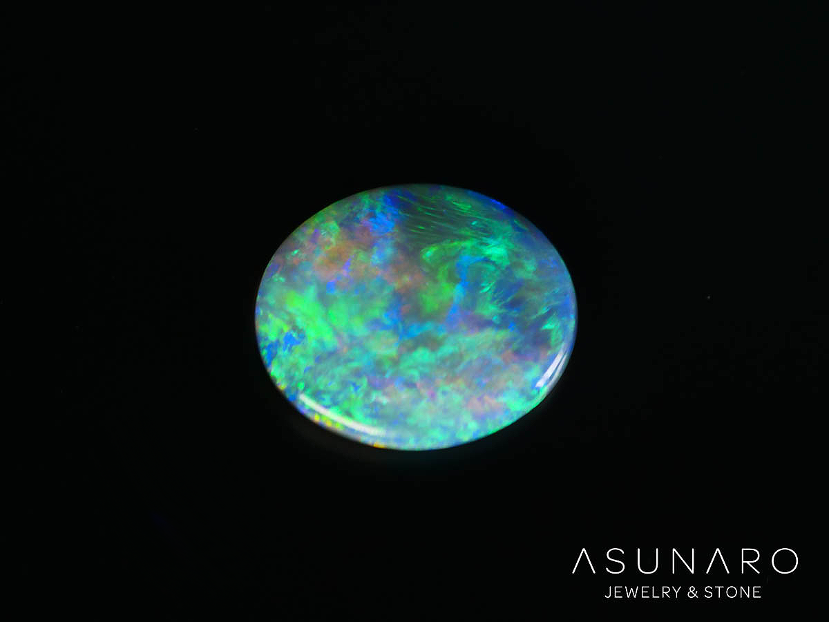 ブラックオパールは、ケイ酸鉱物の一種で、成分中に約10%までの水分を含有する石です。半透明から不透明のもので、黒または他の暗い色の背景に対して遊色効果を出します。遊色の出かたのパターンも数多く、ハーレクイン、リボンなどと名称が付けられています。採掘できるのは、オーストラリアのニューサウスウェールズ州ライトニングリッジで、オパールの中でも最も美しい遊色効果が見られるオパールになります。