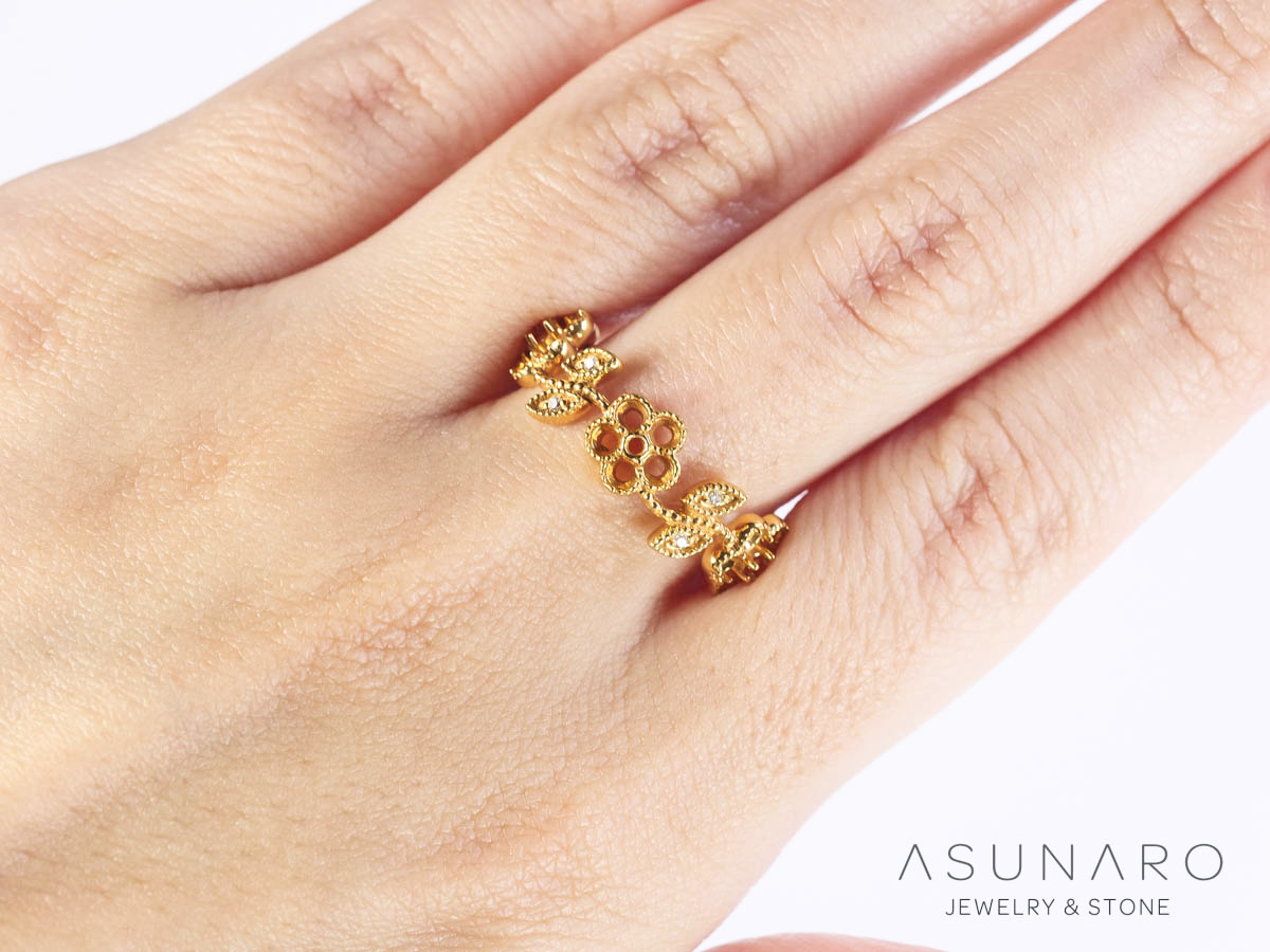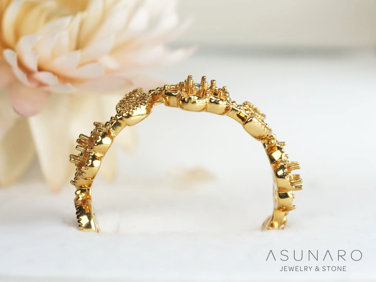 | 空枠番号 | 5520I 指先にお花を纏うアンティーク感溢れる可愛らしいハーフエタニティリング枠です。 こちらの枠はすべてダイヤにして、制作することも可能です。 |
