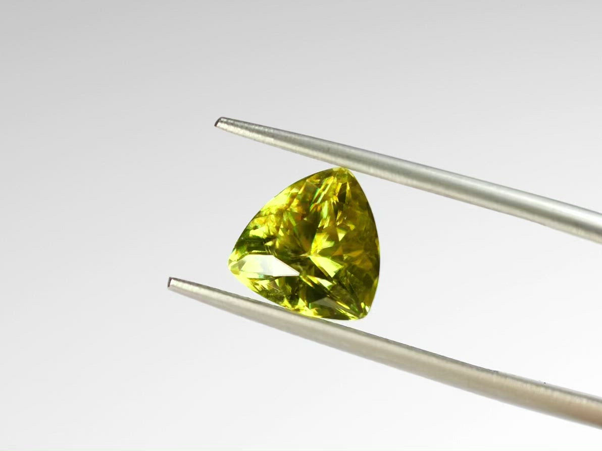 レッドやグリーンを含めた複数のファイアがとても美しく、吸い込まれるかのような魅力溢れるスフェーンです。イエロニッシュグリーンの地色に広がるファイアの煌きが美しく、なんといっても2.47ctのサイズ感のトリリアントカットは存在感抜群です!