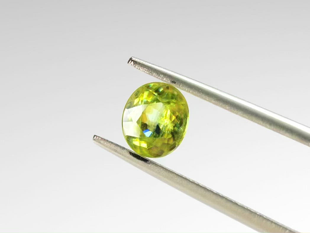 スフェーン独特のファイアが美しく、イエロニッシュグリーンから広がる輝きと、吸い込まれるような魅力が溢れるルースです。